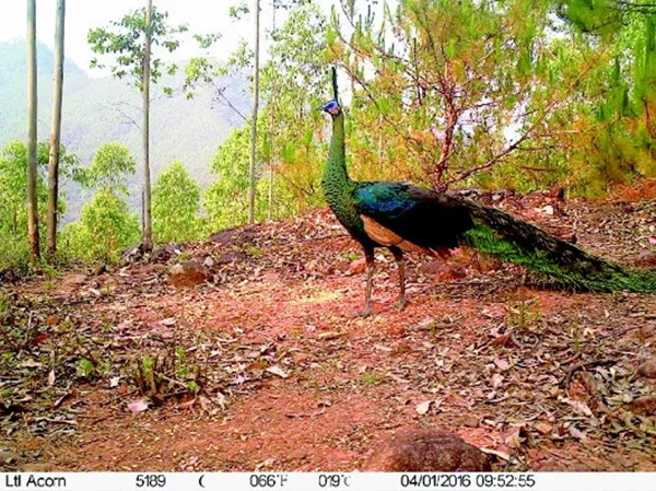 2016年4月1日,通過紅外線照相機(jī)拍攝到的野生綠孔雀。云南省景谷縣森林公安局供圖