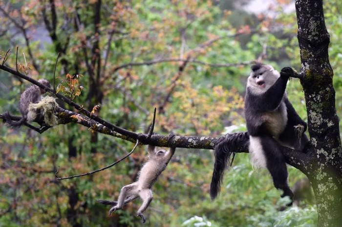 云南省迪慶藏族自治州香格里拉滇金絲猴國家公園里的滇金絲猴(2020年5月23日攝)。新華社記者王長山攝