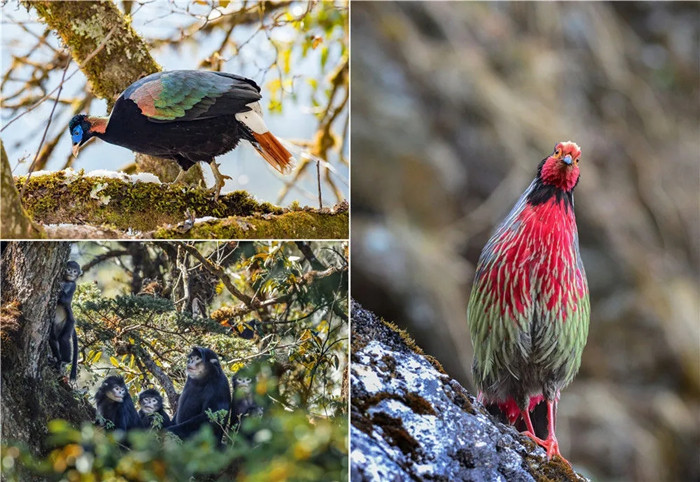 這張拼版照片顯示的是高黎貢山國家級(jí)自然保護(hù)區(qū)的部分野生動(dòng)物,左上為白尾梢虹雉,左下為怒江金絲猴,右為血雉(資料照片)。新華社發(fā)(高黎貢山國家級(jí)自然保護(hù)區(qū)瀘水管護(hù)分局供圖)