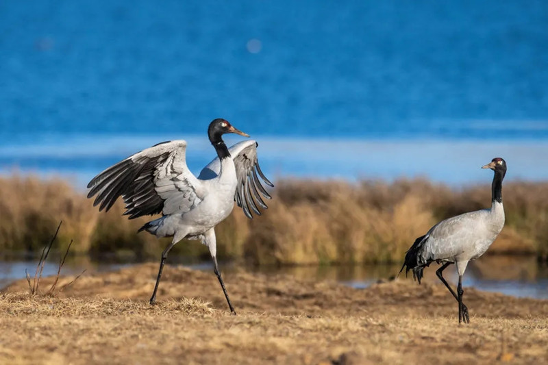 黑頸鶴在云南省昭通市大山包大海子濕地嬉戲(2月24日攝)。新華社記者 胡超 攝